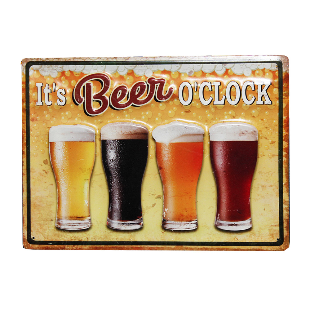 Seinäkyltti It's beer o'clock metallista, jossa on maalaismainen vintage-tunnelma. Tässä versiossa on useita olutlaseja ja teksti It's beer o'clock. Komea kyltti olohuoneeseen, kotibaariin tai pubiin.
