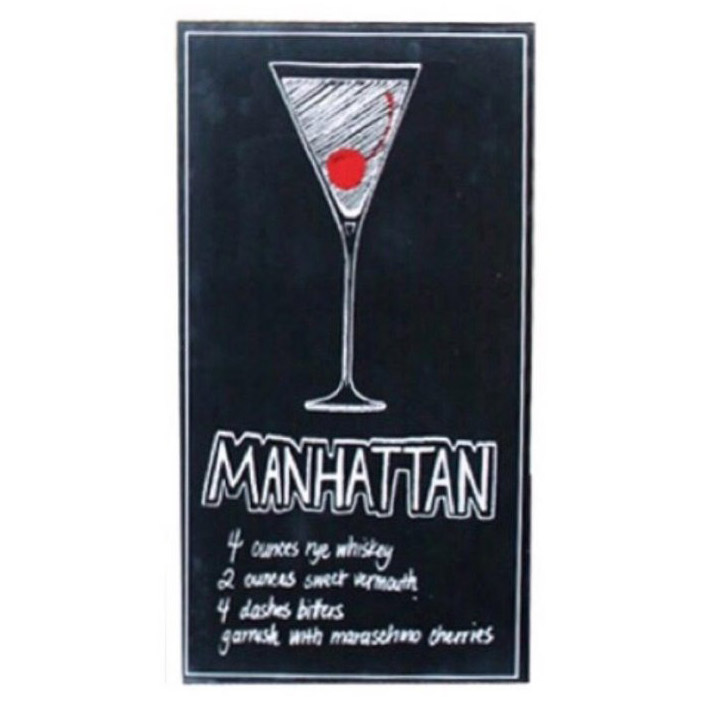 Tyylikäs metalliseinäkyltti, jonka aiheena on Manhattan Cocktail. Kyltti näyttää liuskekiviltä, joka antaa todellisen cocktailbaarin tunnelman ja juoman lisäksi on kirjoitettu myös resepti. Herkullinen kyltti kotibaarissa tai olohuoneessa.