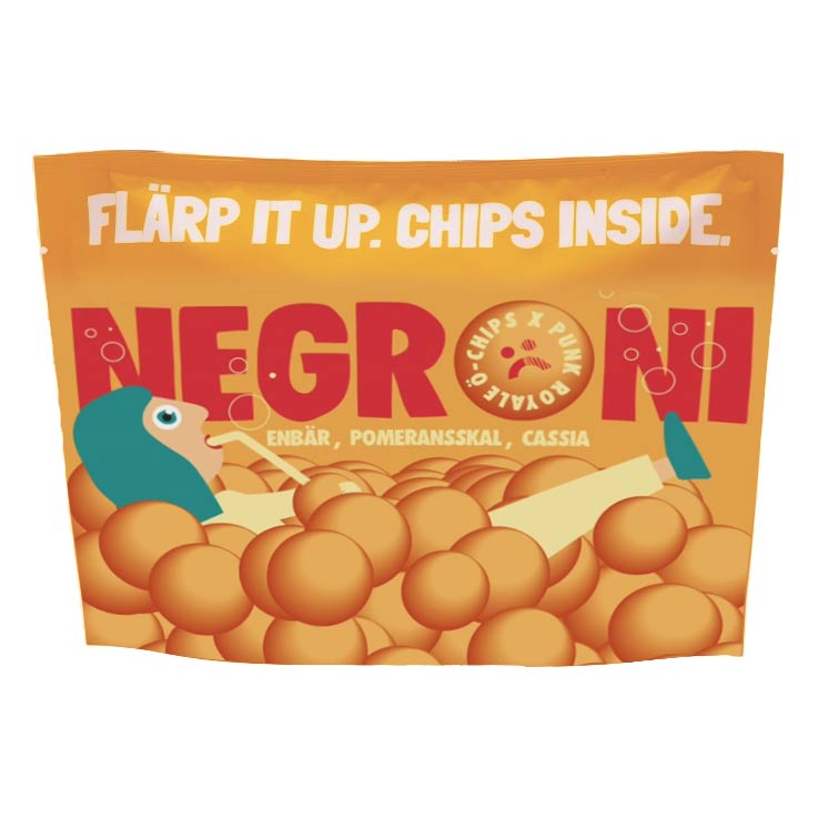 Negroni-lastut - Kataja, pomeranian kuori, kassia 50 g, jotka Ö Chips Gotlannissa valmistettu yhdessä Katherine Bontin kanssa Punk Royalessa. Negroni on Katherinen suosikkijuoma, joka on täydellinen nautittavaksi näiden kitkereiden ja makeiden perunoiden kanssa.