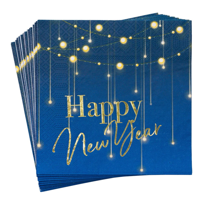 Joten miksi et järjestäisi ikimuistoisia uudenvuodenjuhlia käyttämällä uudenvuoden teemaisia sinisiä lautasliinojamme?