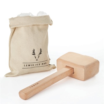 Puinen vasara ja siihen liittyvä jääpussi jäämurskaimelle. Karkea puuvasara, joka suhteellisen pehmeytensä ansiosta toimii erinomaisesti jään murskaamiseen.