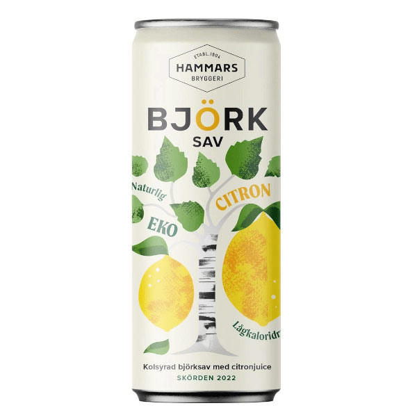 Koivunmahla sitruuna 25 cl Hammars Bryggeriltä, joka on koivun mahlaa valmistettu luomujuoma, joka on maustettu luomumehulla ja vähän, vähän luomu sokeria ja hiilihappoa.