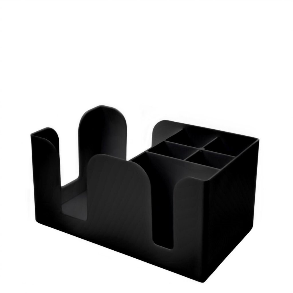 Bar Caddy Hyvä mise en place -teline baarille.Erinomainen lautasliinojen, pillien ja juomatikkujen säilytykseen. Bar Caddyssa on 6 lokeroa: isompi lokero, keskikokoinen ja neljä pientä lokeroa. Valmistettu mustasta kovasta muovista.