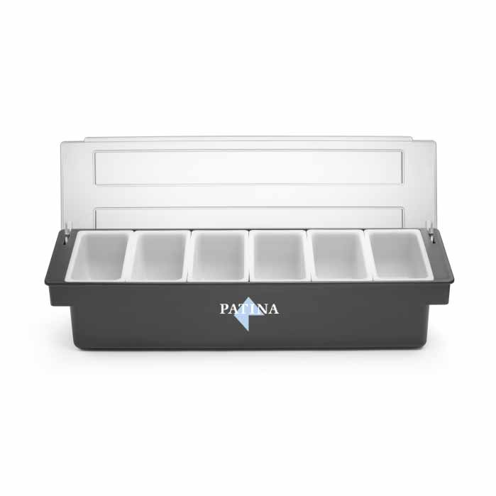 Cocktail-annostelija Patina. Erinomainen "mis en place" -säilytys juomien ainesosille. Tässä mallissa on kuusi lokeroa ja muovinen kansi.