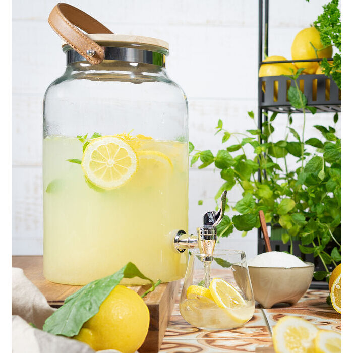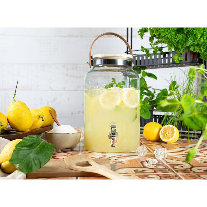 Luonnollinen kikansi pitää sisällön raikkaana, ja elegantti nahkahihna tekee dispenserin kuljettamisesta helppoa. Yhdistelmä käytännöllisyyttä ja tyyliä, joka tuo tarjoiluun rustiikkisen mutta modernin tunnelman tyylikkään hanan avulla.