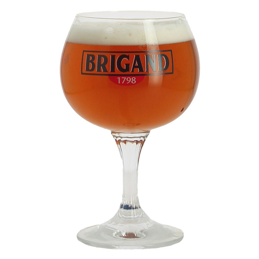 Brigand-olutlasi, jonka sivulle on painettu panimon logo sinisellä tekstillä. Brigand-olutlasissa on uurrettu jalka ja se on laadukkainta ja Belgialaisen Van Honsebrouckin panimon luoma. Lasi sisältää 33 cl ja on paras tapa Nauti tästä upeasta oluesta Nämä tuotteet ovat myös erittäin suosittuja lahjoja sekä itsellesi että muille.