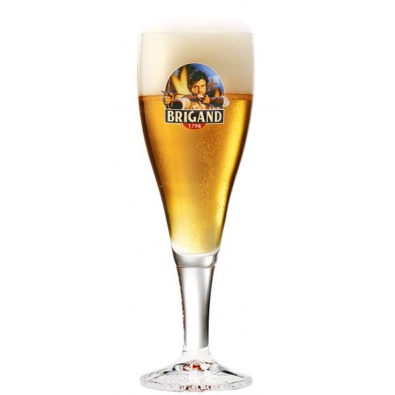 Brigand-Olutlasi on komea Fluteglas Brigand-brändin korkealla jalalla, jonka etupuolelle on painettu klassinen olkiryöstön kuva.