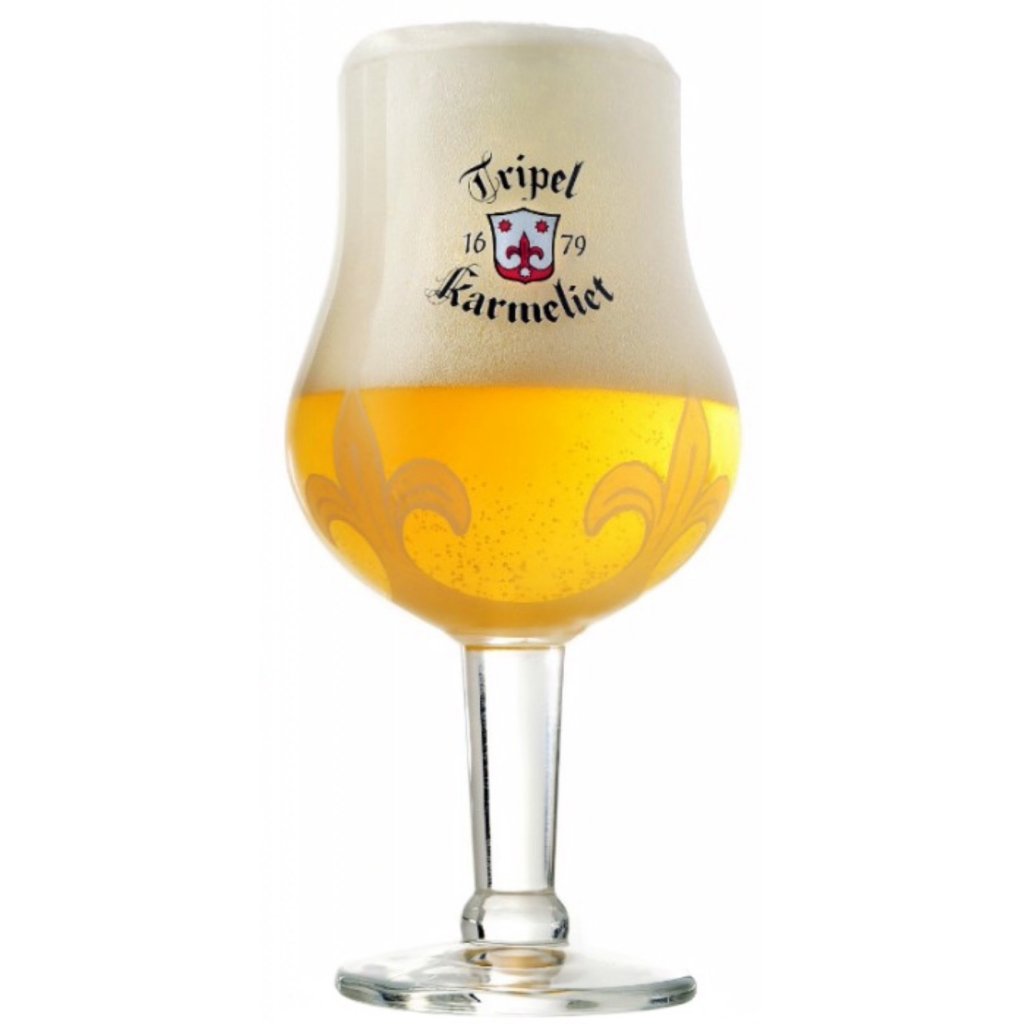 Tripel Karmeliet -olutlasi. Klassinen luostariolut Tripel Karmeliet valmistetaan Karmeliitin muinaisen reseptin mukaan. Käytössä on muun muassa kolme erilaista viljaa ja salainen mausteseos. Tässä suuressa ja kauniisti kupitussa olutlasissa on huurrettuja liljoja pesän ympärillä ja etupuolelle painettu Tripel Karmelietin logo.vakaa varsi ja jalka,suositeltu tilavuus 30cl olutta ja reilu vaahtokruunu.