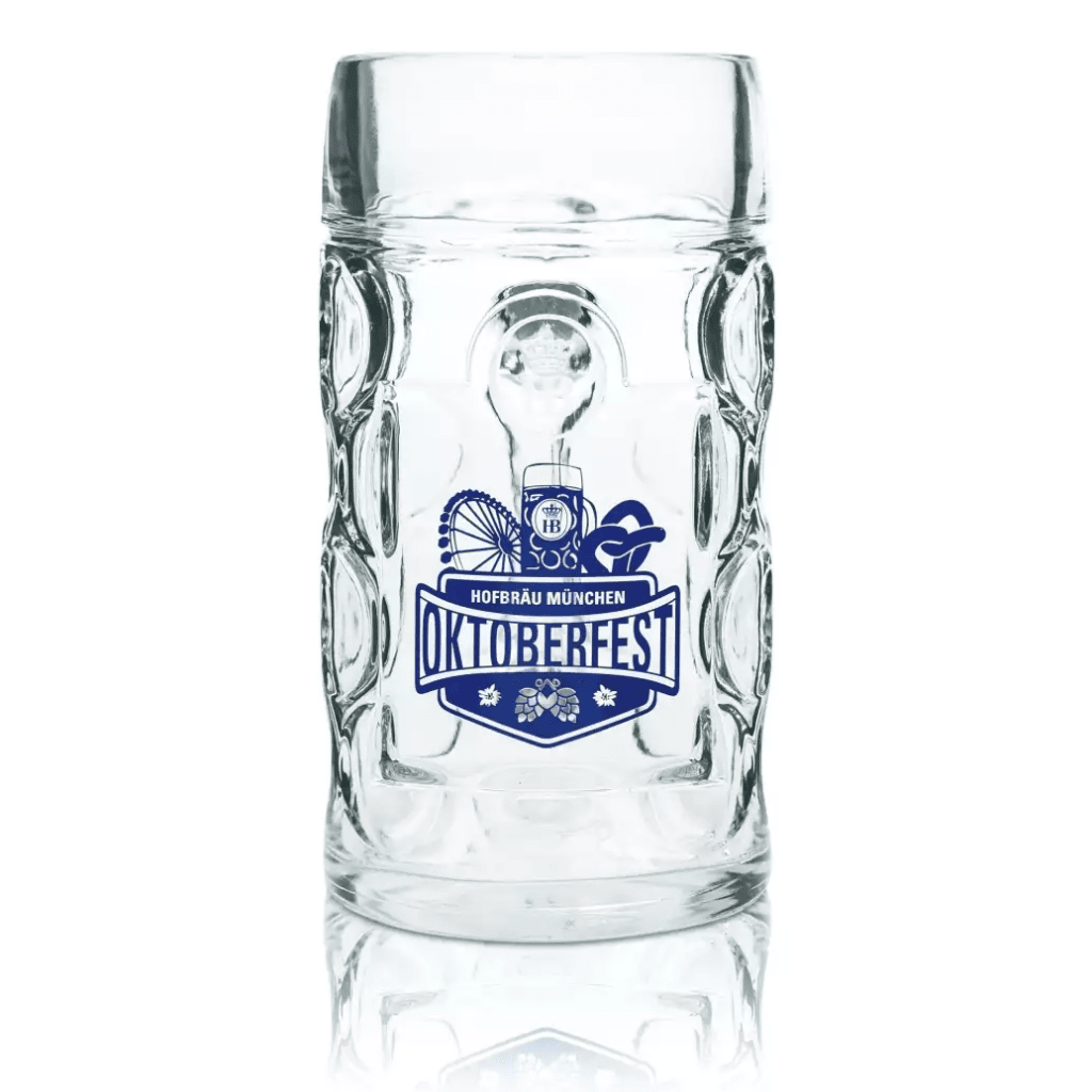 Hofbräu Oktoberfest -olutmuki 100 cl klassiseen Oktoberfest-olueen! Tämä lasi on erikoispainos Münchenin Oktoberfestille, ja sen ulkopuolella on erilainen logo kuin panimolla.