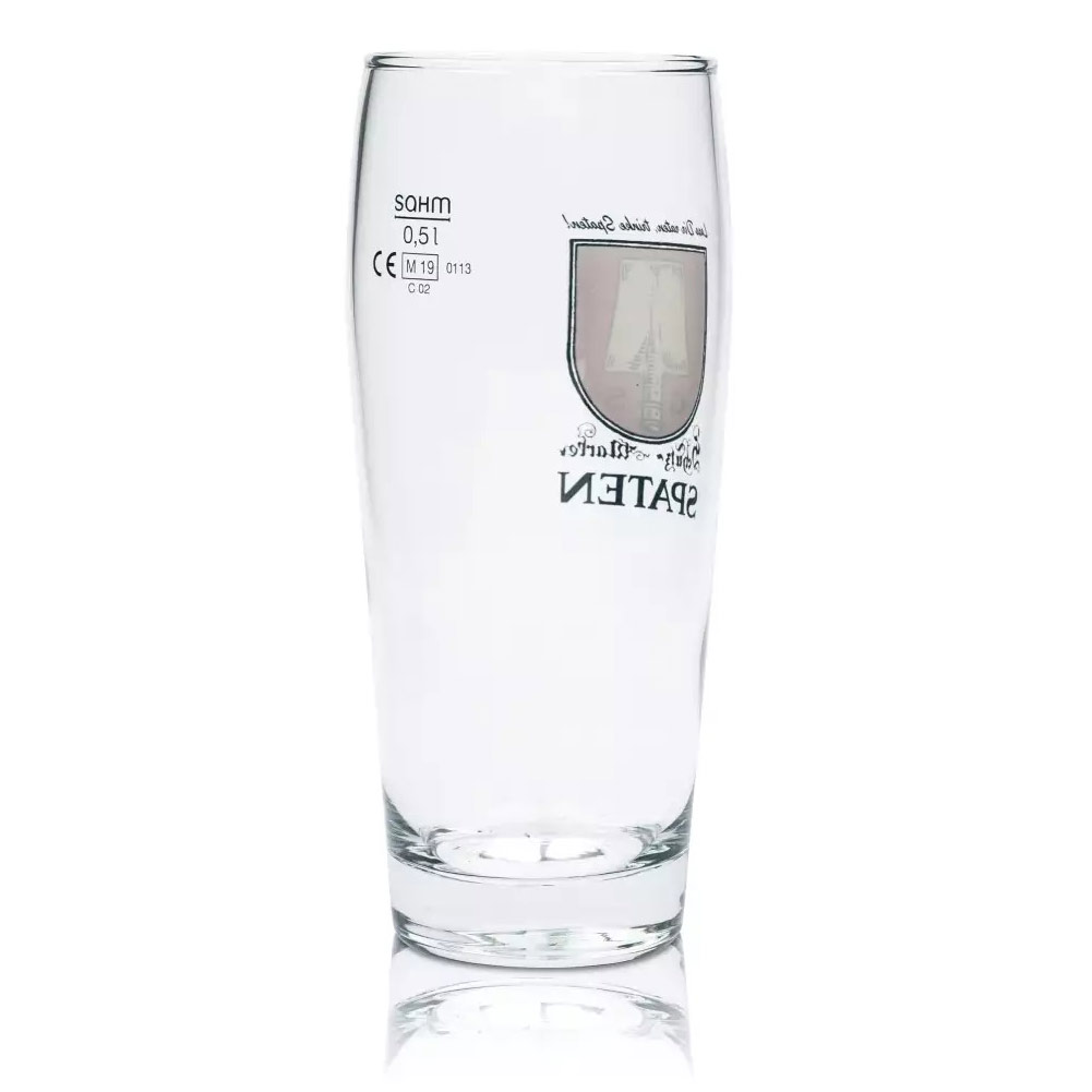 Tässä olutlasissa on Spaten-logo, jonka etupuolelle on painettu lapio ja takana 50 cl merkintä, jossa on tilaa vaahtokruunulle.