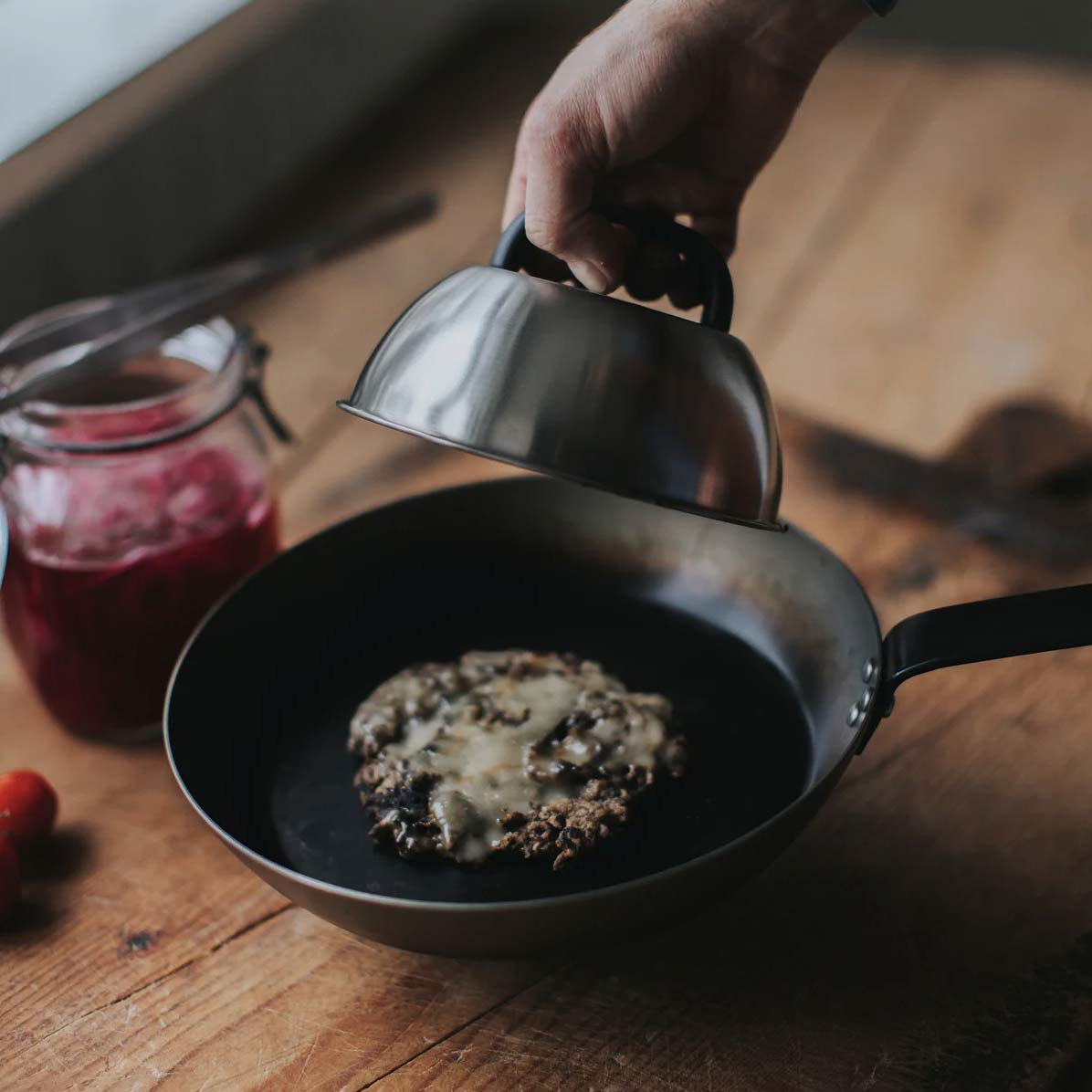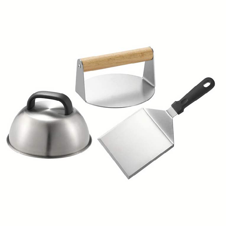 Setti sisältää painimen, lastan ja kannen, jotka toimivat tehokkaasti yhdessä: painin puristaa lihan tasaisesti optimaalista paistopintaa varten, lasta helpottaa hampurilaisen kääntämistä ja käsittelyä, ja kansi auttaa säilyttämään lämmön ja sulattamaan juuston täydellisesti. Lopputulos? Nopeampi kypsennys, parempi maku ja ammattimainen lopputulos kotona.