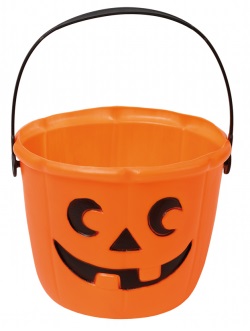 Karkkiämpäri Halloween. Oranssi muoviämpäri klassisella Halloween-kurpitsalla. Trick or treat! Kaikkien ihmissusien, haamujen ja noidien on kerättävä karkkinsa jostain. Tai miksi et tarjoa siruja ja leikattuja sormenpäitä siinä Halloween-juhlissa?