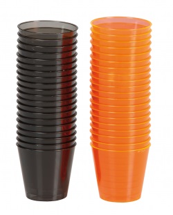 Haulilasi muovia, 40 kpl. 20 oranssia ja 20 mustaa shottilasia. Täydellinen Halloweeniin!