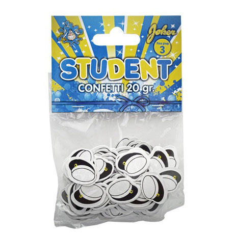 Konfettipussi, joka koostuu pienistä opiskelijahattuista. Täydellinen käytettäväksi opiskelijajuhlissa, opiskelijaennätyksen kattaukseen tai vastaanotossa.